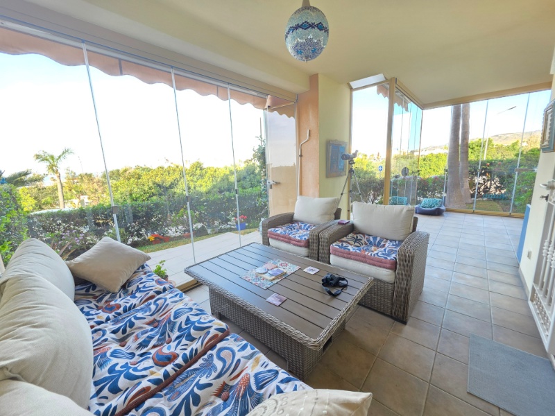 Step outside to enjoy the lovely covered terrace equipped with glass curtains, making it an ideal spot for year-round enjoyment. The beautifully landscaped gardens of the urbanisation provide a serene backdrop, complemented by two inviting pools just a stone’s throw away. With direct access to the beach, this apartment is perfect for those who love coastal living.