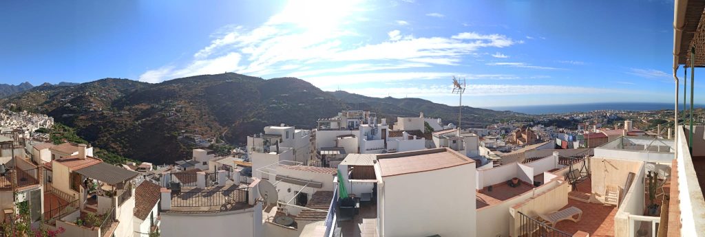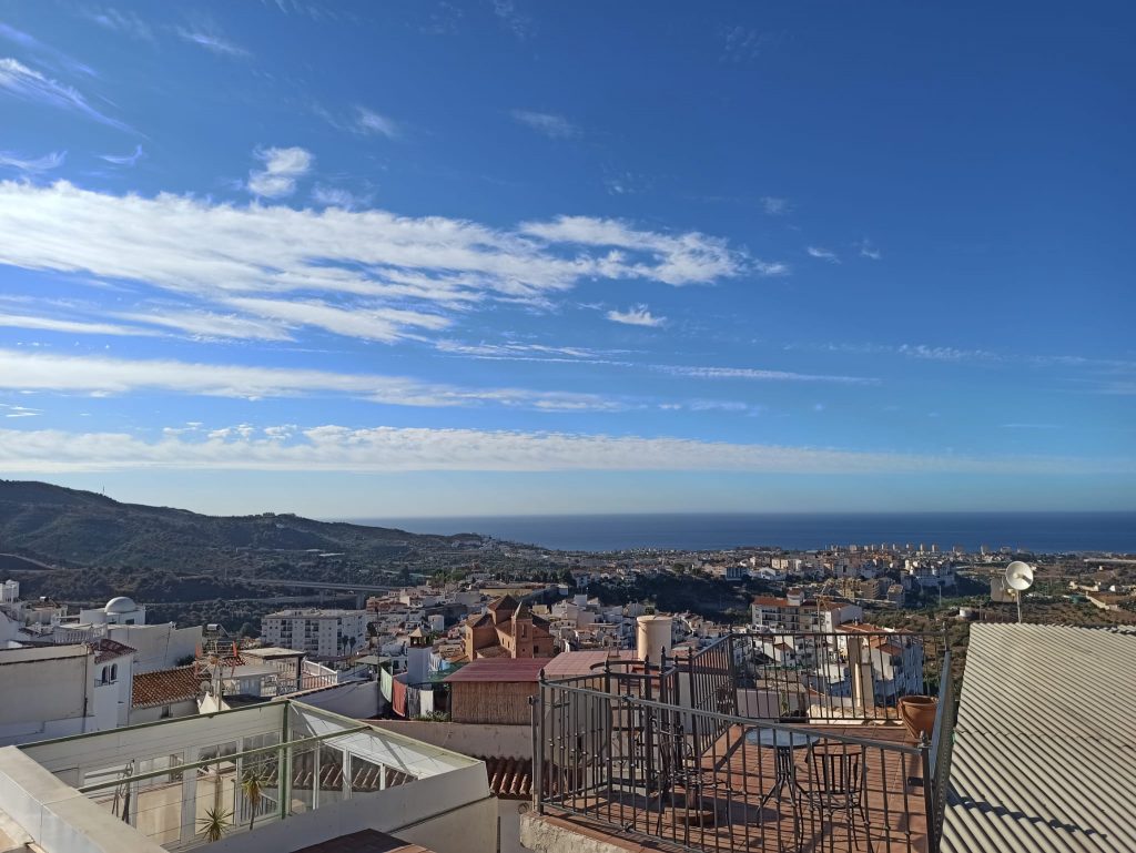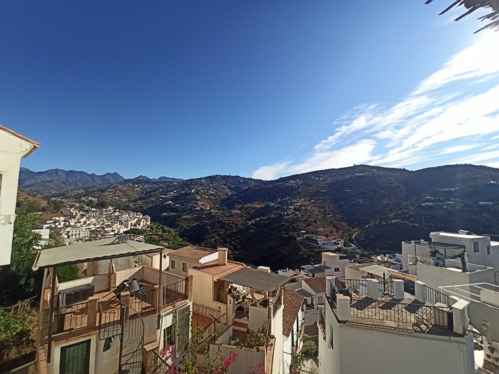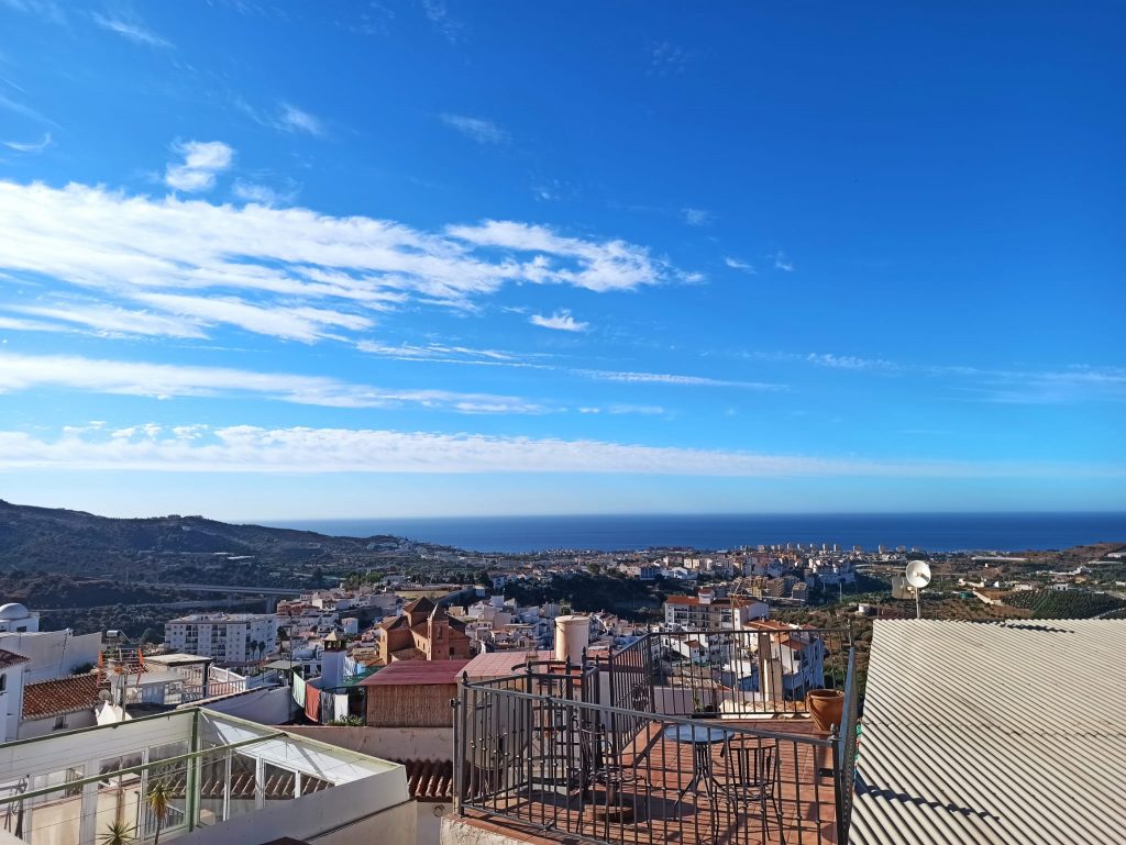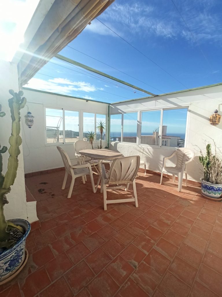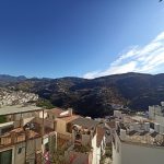 Very spacious village house with spectacular panoramic views due to its wonderful elevated geographical location. This property has 3 floors (ordered from the lowest in the photos), with the first floor having a spacious dining room, a large kitchen with an island, a living room (it can be converted into a bedroom), the full bathroom and the Main bedroom. Going to the second floor we will find two magnificent double rooms that open onto two of the property’s terraces; one of these two terraces leads to a large room equipped with a fireplace (another possible bedroom). On the third level the property has the third large terrace with a door to the garage, which is quite extensive and overlooks the street above. This garage can be converted into a workshop room or just another bedroom. If you are looking for a large house with enough space, this property is a great option.