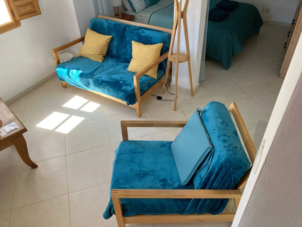 Upstairs, you’ll find a very spacious bedroom that becomes the perfect retreat for relaxation. The living area, with its large wooden windows, allows natura light to flood the space while you enjoy views of the countryside and the street. Furthermore, the large terrace is a true oasis: it features a covered area and a sunbathing area, where you can relax while contemplating the majestic mountains that surround the property.